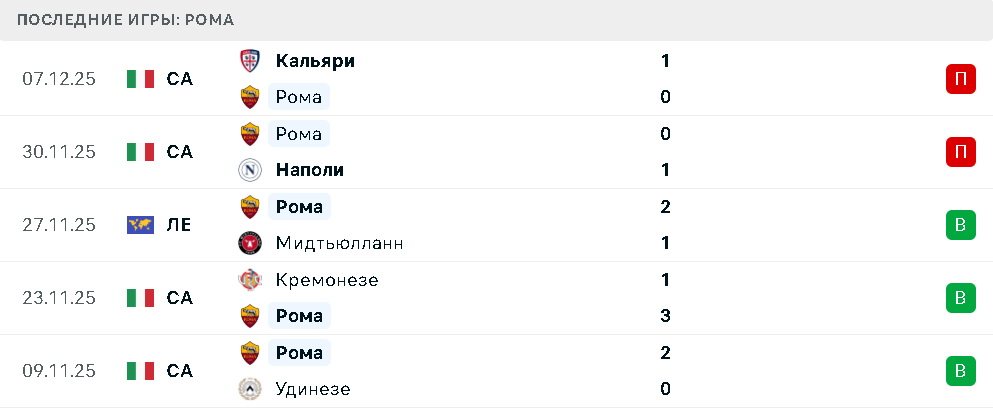 «Рома» проиграла два последних матча — «Наполи» и «Кальяри». До этого были победы над «Удинезе», «Кремонезе» и «Мидтьюлланном».
