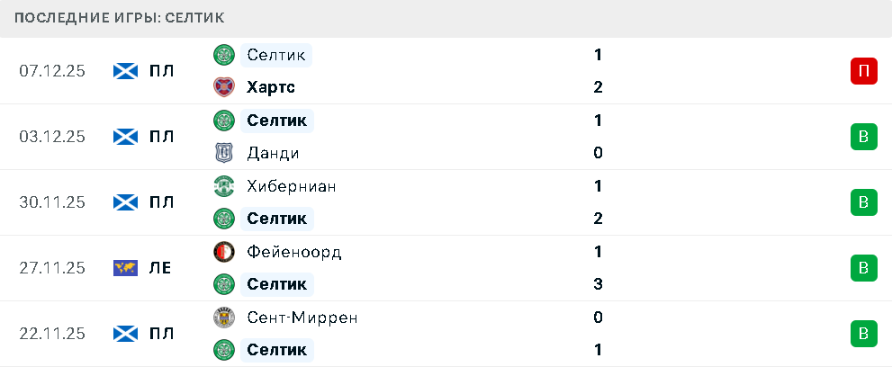Поражение в последнем туре чемпионата Шотландии от «Хартса» стало единственным для «кельтов» в пяти последних матчах. До этого «Селтик» победил «Сент-Миррен», «Фейеноорд», «Хиберниан» и «Данди».