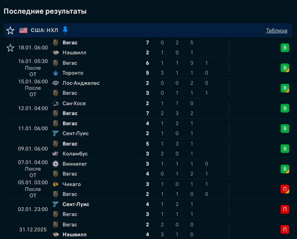«Вегас» обыграл «Нэшвилл» (7:2), «Торонто» (6:5 ОТ), «Лос-Анджелес» (3:2 ОТ), «Сан-Хосе» (7:2) и «Сент-Луис» (4:2). В шести из семи последних матчей проходил тотал больше 5,5 шайб. Команда забивает минимум по 4 шайбы в каждом домашнем матче нового года.