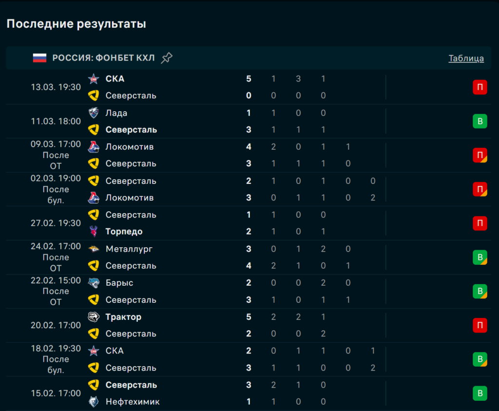 Последние игры Северсталь