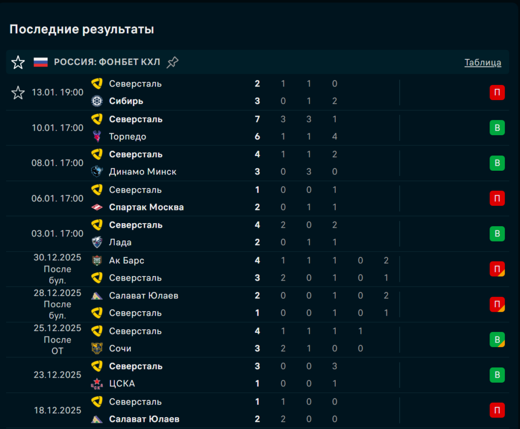 13 января «Северсталь» уступила «Сибири» (2:3), потеряв преимущество в два гола. До этого одержала победы над «Торпедо» (7:6) и «Динамо Минск» (4:3), а также выиграла у «Лады» (4:2). Поражение от «Спартака» (1:2) стало единственным домашним провалом в январе. В четырёх из пяти последних матчей проходил тотал больше 5,5 шайб.