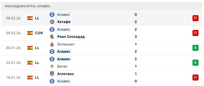 Баски потерпели домашнее поражение от Хетафе 0:2, не сумев забить на своем поле. Перед этим Алавес уступил Реал Сосьедаду в четвертьфинале Кубка Испании 2:3, хотя дважды отыгрывался в том матче.