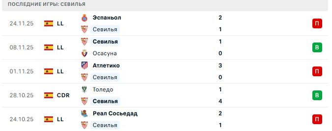 В ноябре команда уступила «Эспаньолу» (2:1) и «Атлетико» (3:0), прервав короткую победную серию. Домашние стены остаются главным козырем — именно здесь «Севилья» демонстрирует наиболее организованную игру.