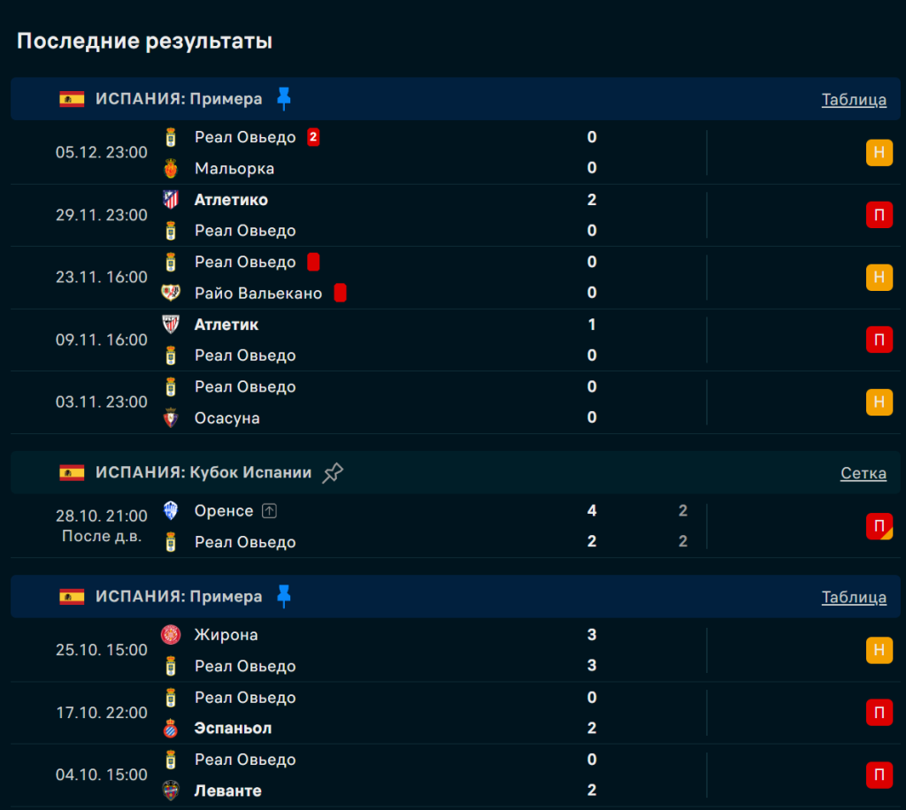 «Овьедо» — худшая атака лиги (7 голов за 15 туров). Последние 5 матчей — 3 ничьи 0:0 и 2 поражения 0:1 и 0:2. Команда не забивает 5 туров подряд и играет исключительно от обороны. xG атаки — всего 0,71 за игру. Оборона пропустила лишь 3 гола за последние 5 матчей, но против «Севильи» такой стиль может обернуться пассивностью.