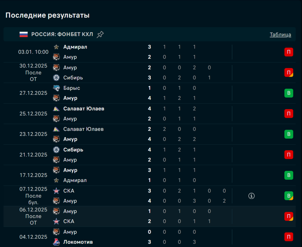 «Амур» демонстрирует более структурированную игру: 2,3 заброшенных и 2,7 пропущенных шайбы в среднем за матч. На выезде команда особенно осторожна — делает ставку на контратаки и плотную оборону в своей зоне. При этом реализация остается слабым местом: 7,5% по броскам в створ — худший показатель в лиге. Несмотря на отсутствие Гальченюка, «тигры» выглядят системно, особенно в третьих периодах: проиграли всего один раз в последних 8 матчах после 50-й минуты.
