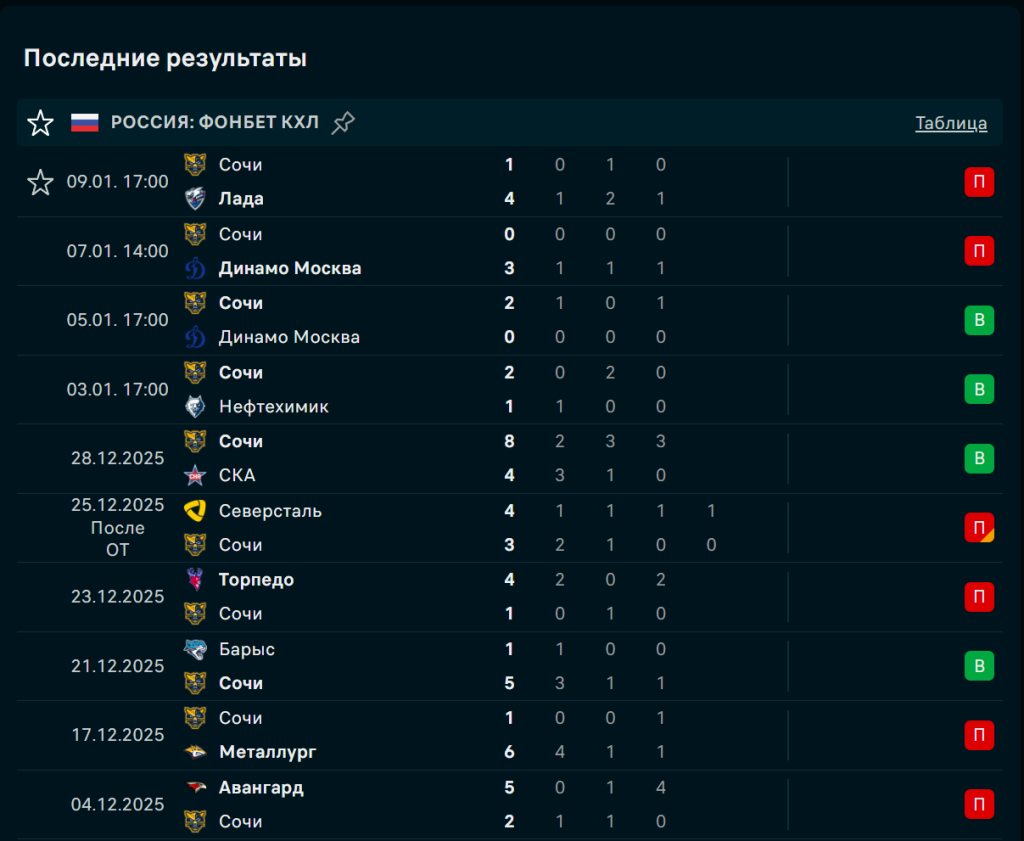 Последние игры ХК Сочи