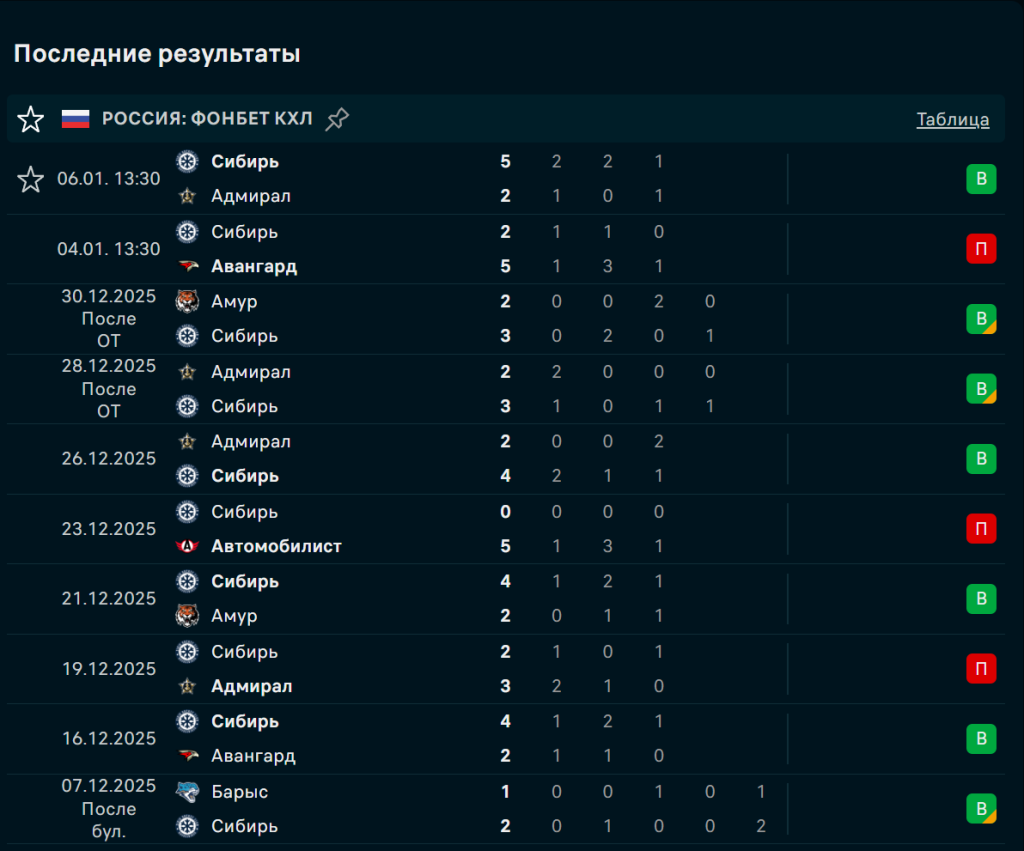 6 января «Сибирь» обыграла «Адмирал» (5:2), 4 января уступила «Авангарду» (2:5), 30 декабря победила «Амур» в овертайме (3:2), 28 декабря взяла реванш у «Адмирала» (3:2 ОТ), 26 декабря выиграла у того же соперника (4:2). В трёх из пяти матчей проходил ТБ(5,5), но все поражения сопровождались крупными пропусками.