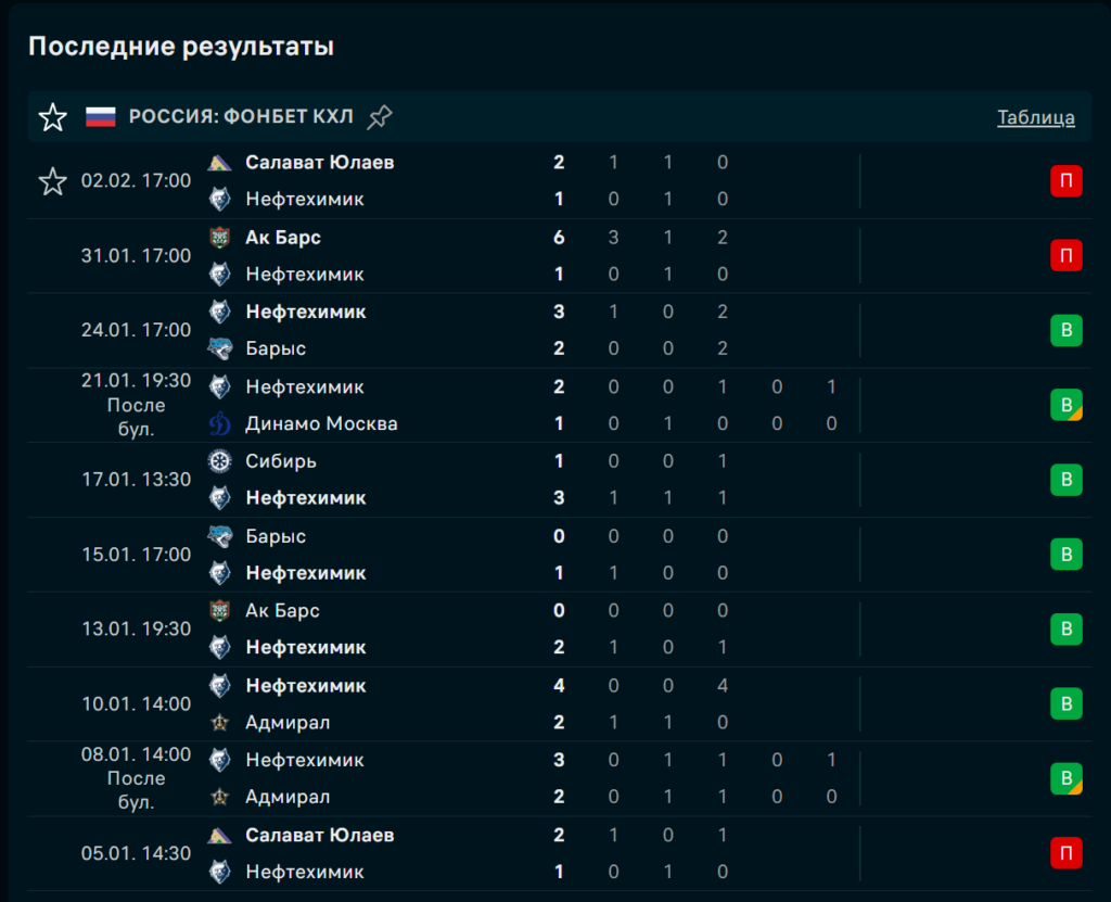 Последние игры Нефтехимик Нижнекамск