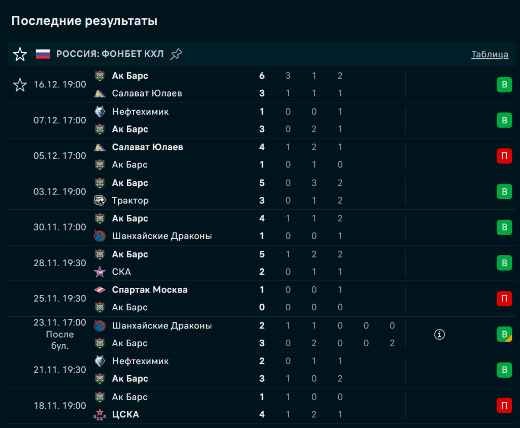 - «Ак Барс» забивает ≥3 шайб в 4 из 5 последних матчей
