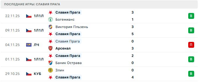 В ноябре команда потерпела разгромное домашнее поражение от «Арсенала» (0:3) в Лиге Чемпионов, прервав серию из 12 матчей без поражений дома. Ранее была зафиксирована нулевая ничья с «Аталантой» и поражение от «Интера» (0:3). В чемпионате Чехии пражане продолжают демонстрировать стабильные результаты.