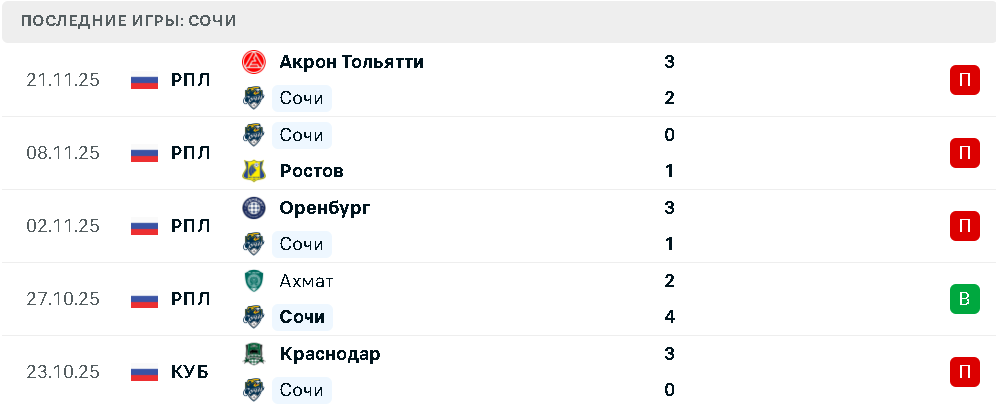 В пяти последних матчах сочинцы одержали лишь одну победу — в гостях над «Ахматом». В остальных встречах команда проиграла «Краснодару», «Оренбургу», «Ростову» и «Акрону».