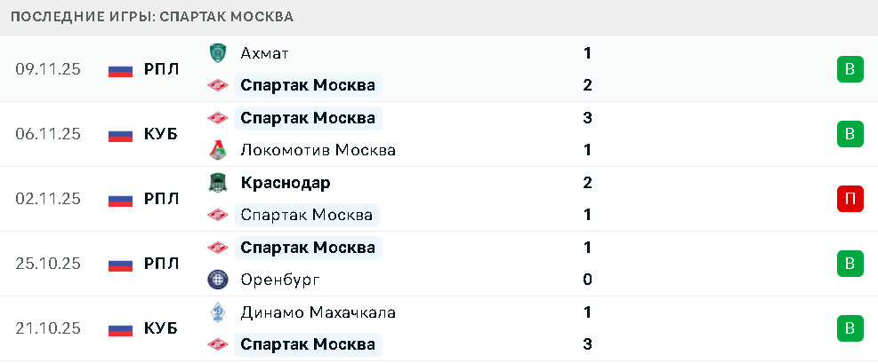 В пяти последних матчах спартаковцы потерпели только одно поражение от действующего чемпиона Краснодара. В рамках Кубка России «красно-белые» обыграли махачкалинское Динамо и Локомотив, а в чемпионате справились с Оренбургом и Ахматом.