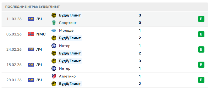 - Единственная очная встреча завершилась победой Буде/Глимт 3:0