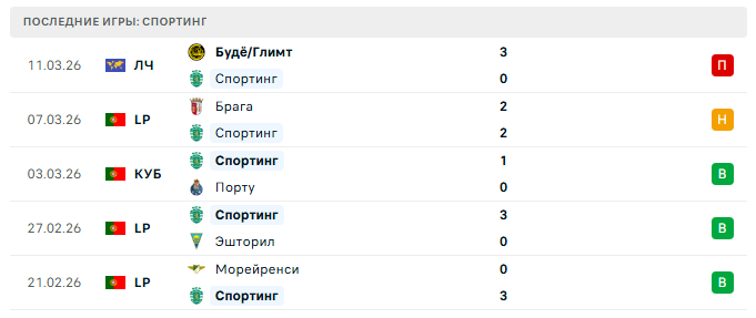 11 марта разгромили «Спортинг» 3:0 на своём поле — чистый, контролируемый матч без нервов и случайностей.