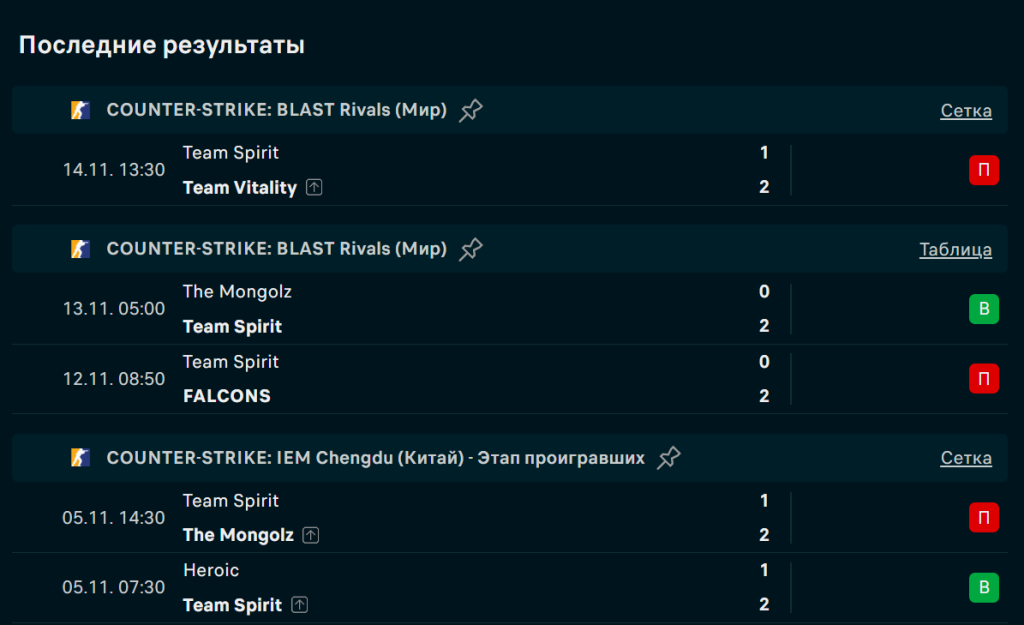 Последние игры Team Spirit