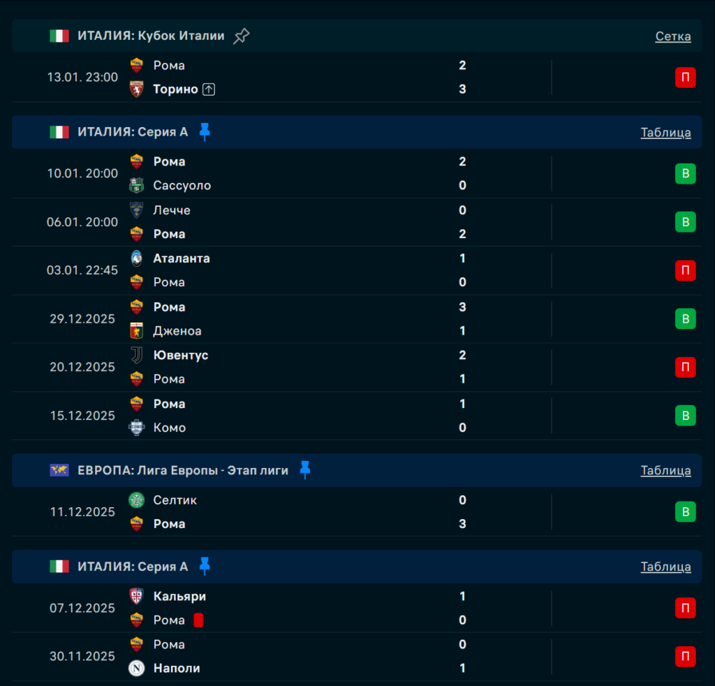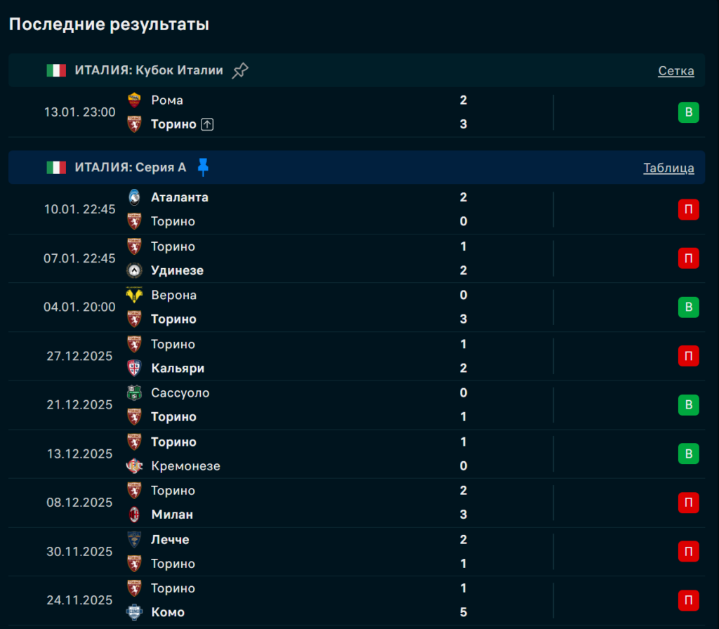 18 января, 20:00 МСК, «Стадио Олимпико Гранде Торино», Турин. 21-й тур Серии А. «Торино» занимает 12-е место с 23 очками, пропустив 32 гола — худший показатель среди команд, не находящихся в зоне вылета. Команда одержала две победы в пяти последних матчах, включая сенсационную викторию над «Ромой» (3:2) в Кубке Италии 13 января. «Рома» идёт пятой с 39 очками, но переживает кризис: два поражения подряд от «Аталанты» (0:1) и «Торино», несмотря на лучшую оборону лиги (12 пропущенных). Гости мотивированы взять реванш, особенно учитывая, что в Серии А они не проигрывают на выезде с ноября.