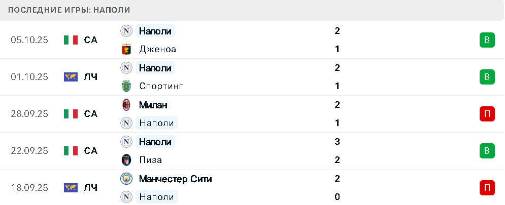 В пяти последних матчах в разных турнирах неаполитанцы потерпели поражения от Манчестер Сити и Милана, а также одержали победы над Пизой, Спортингом и Дженоа.
