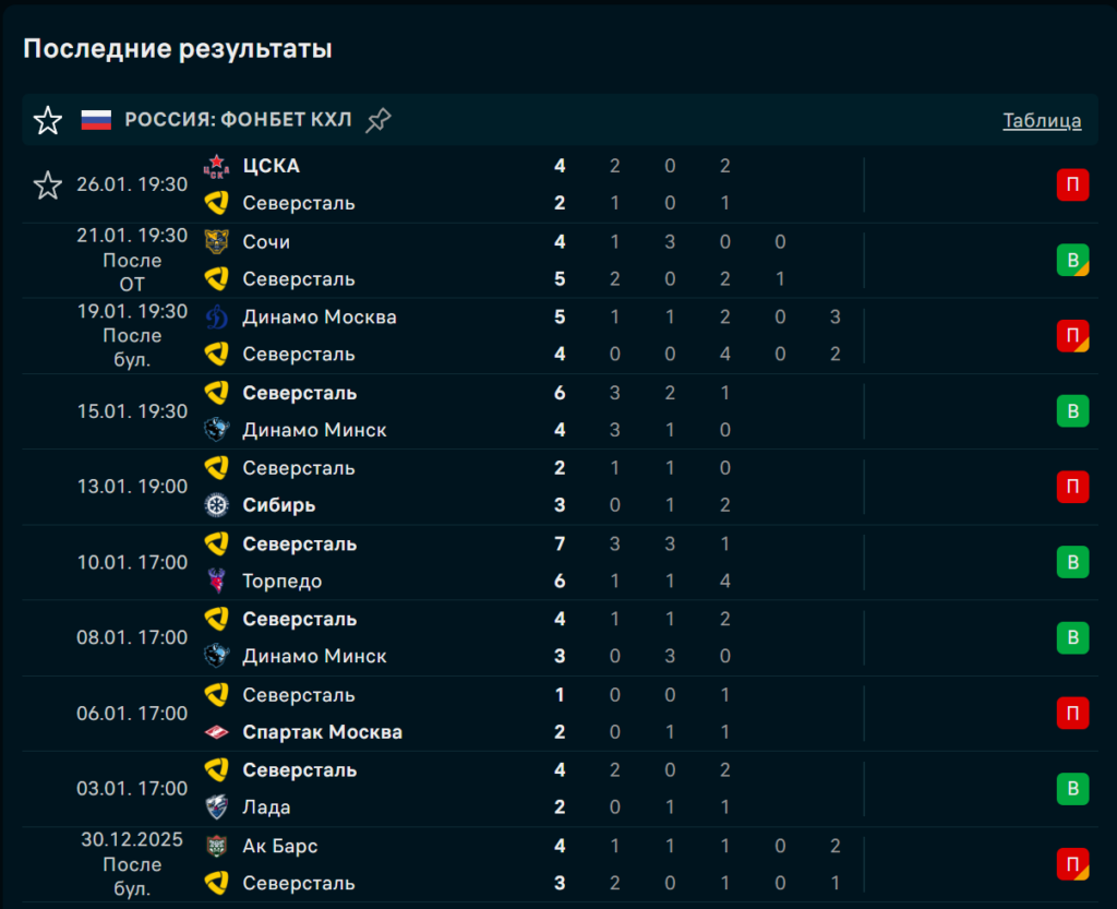 «Северсталь» же продолжает жить по принципу «забью больше». В последних десяти матчах 38 голов забито, 37 пропущено. Руслан Абросимов в форме: 9 очков в 6 играх. Но защита череповчан — дырявая даже в лучших днях. На выезде они набрали 29 очков, но в последних семи гостевых матчах — пять поражений. Против ЦСКА (2:4), «Динамо» (4:5) и «Сибири» (2:3) они проигрывали, несмотря на голы. Их стиль рискован, и он часто оборачивается провалами в ключевые моменты.