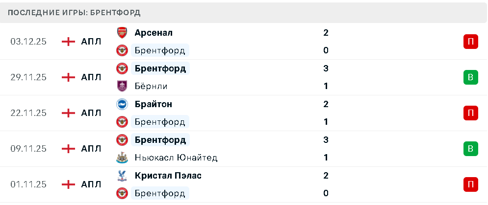В пяти предыдущих матчах Брентфорд одержал две победы — над Ньюкаслом и Бернли, а также проиграл Кристал Пэлас, Брайтону и Арсеналу.