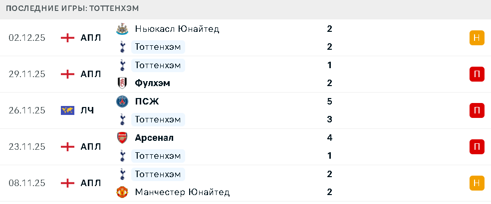 В пяти предыдущих матчах Тоттенхэм не одержал ни одной победы: три поражения от Арсенала, ПСЖ и Фулхэма, а также ничьи с Манчестер Юнайтед и Ньюкаслом.