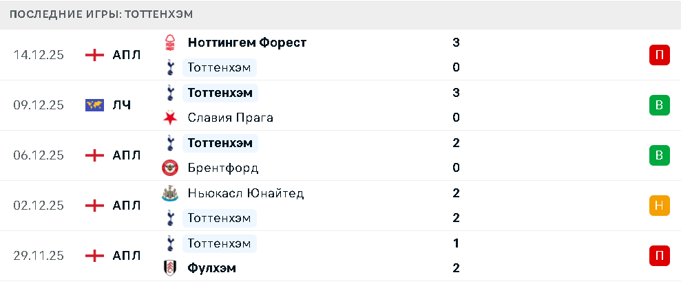 В пяти последних матчах во всех турнирах «шпоры» потерпели два поражения — от «Фулхэма» и «Ноттингем Форест». Между этими неудачами были встречи с «Брентфордом» и «Славией», а также ничья с «Ньюкаслом».