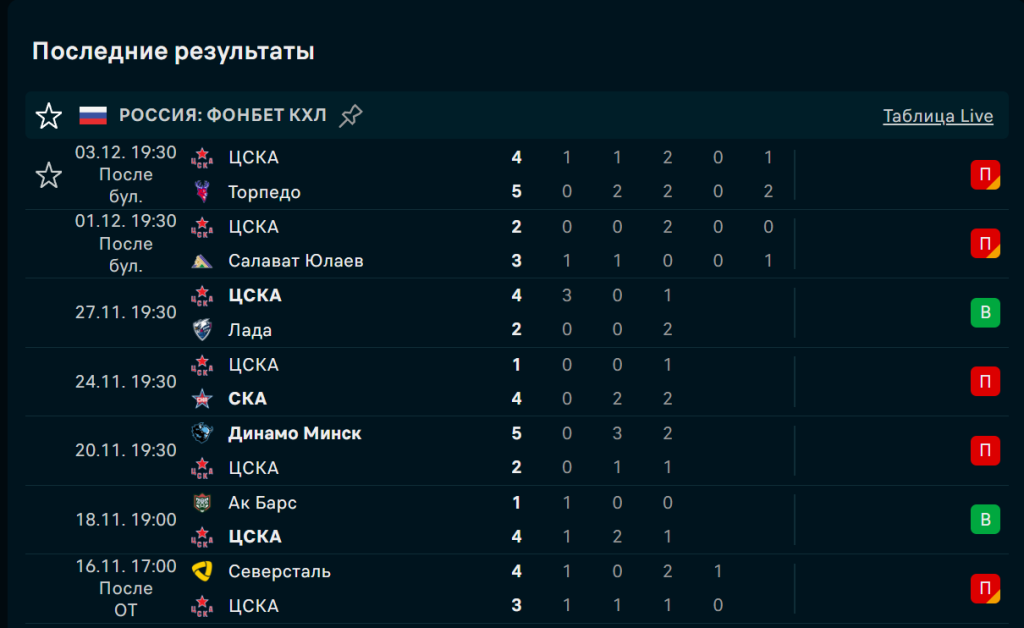 В последних пяти матчах ЦСКА выиграл один раз и четыре раза проиграл. Среди результатов — победа над «Ладой» (4:2) и поражения от СКА (1:4), «Салавата» (2:3 Б), «Торпедо» (4:5 Б) и минского «Динамо» (2:5). Команда не может удержать преимущество и допускает системные ошибки в защите, особенно в выездных матчах.