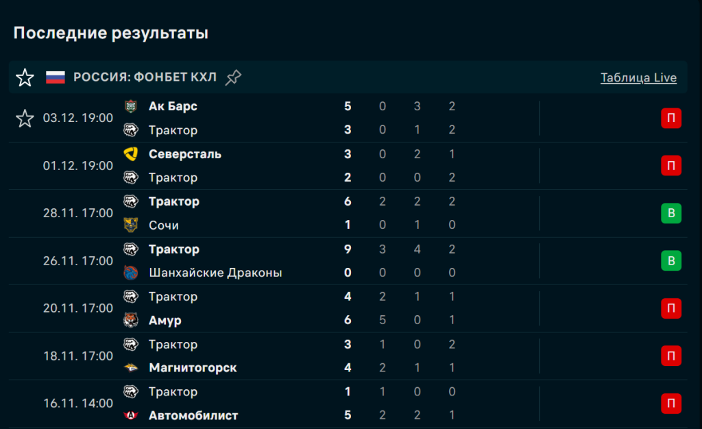 В последних пяти матчах «Трактор» выиграл дважды и трижды проиграл. Победы над «Шанхаем» и «Сочи» стали результатом высокой реализации и домашнего фактора. Поражения в выездных матчах показали, что команда уязвима против сильных соперников, особенно в третьих периодах. Тем не менее, на своей площадке «Трактор» остаётся опасным соперником даже для топ-команд.