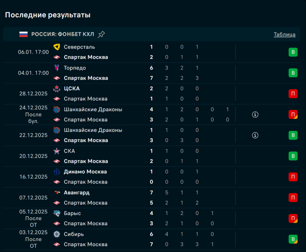 - Спартак пропускает ≥3 шайб в 4 из 5 матчей