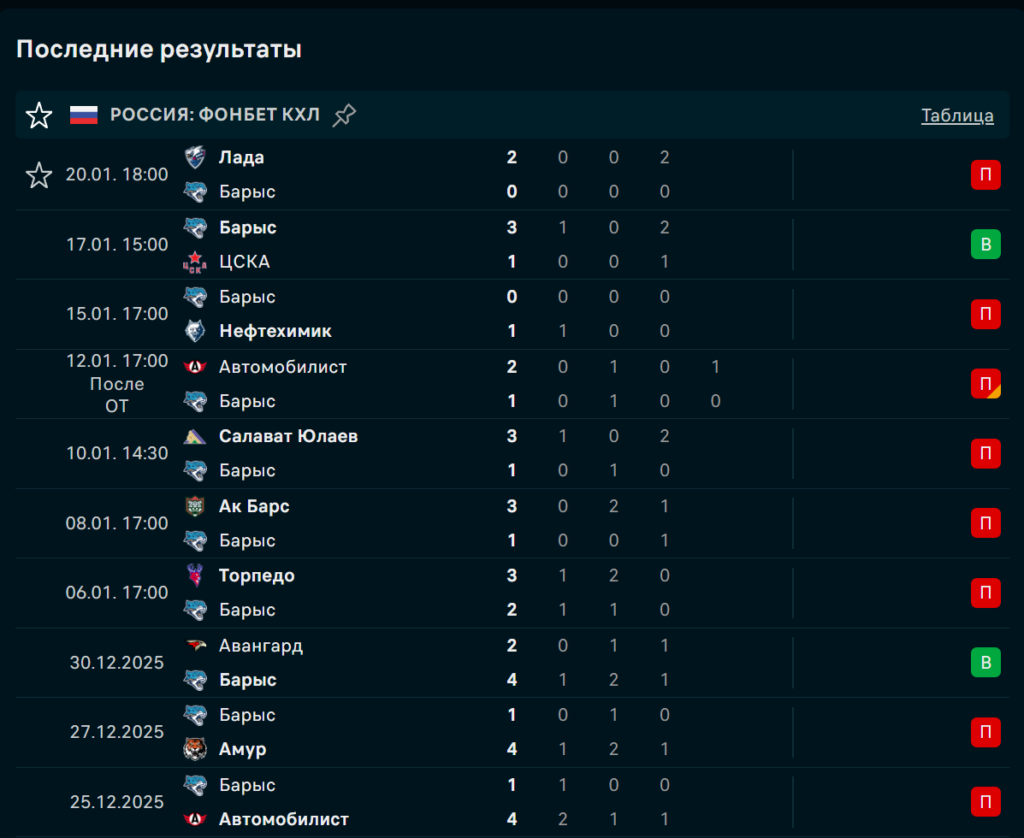 «Барыс» переживает глубокий кризис на выезде: всего 5 побед в 22 матчах, худшая реализация лиги (7,1%). Недавняя победа над ЦСКА стала исключением на фоне четырёх поражений подряд. Команда пропускает в среднем 3,4 шайбы за игру в январе, а в первом периоде забивает реже всех в КХЛ (0,5 гола).