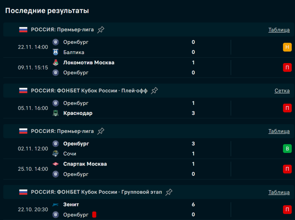 «Оренбург» балансирует на грани вылета: 12 очков, 17 забитых, 26 пропущенных. Последняя победа — над «Сочи» 3:1 ещё в начале ноября. С тех пор — ничья с «Балтикой» и поражения от «Локомотива» (0:1), «Краснодара» (1:3) и «Спартака» (0:1). Команда Владимира Муминовича не забивает в 3 из 5 последних матчей, а на выезде — проиграла 6 из 7 встреч.
