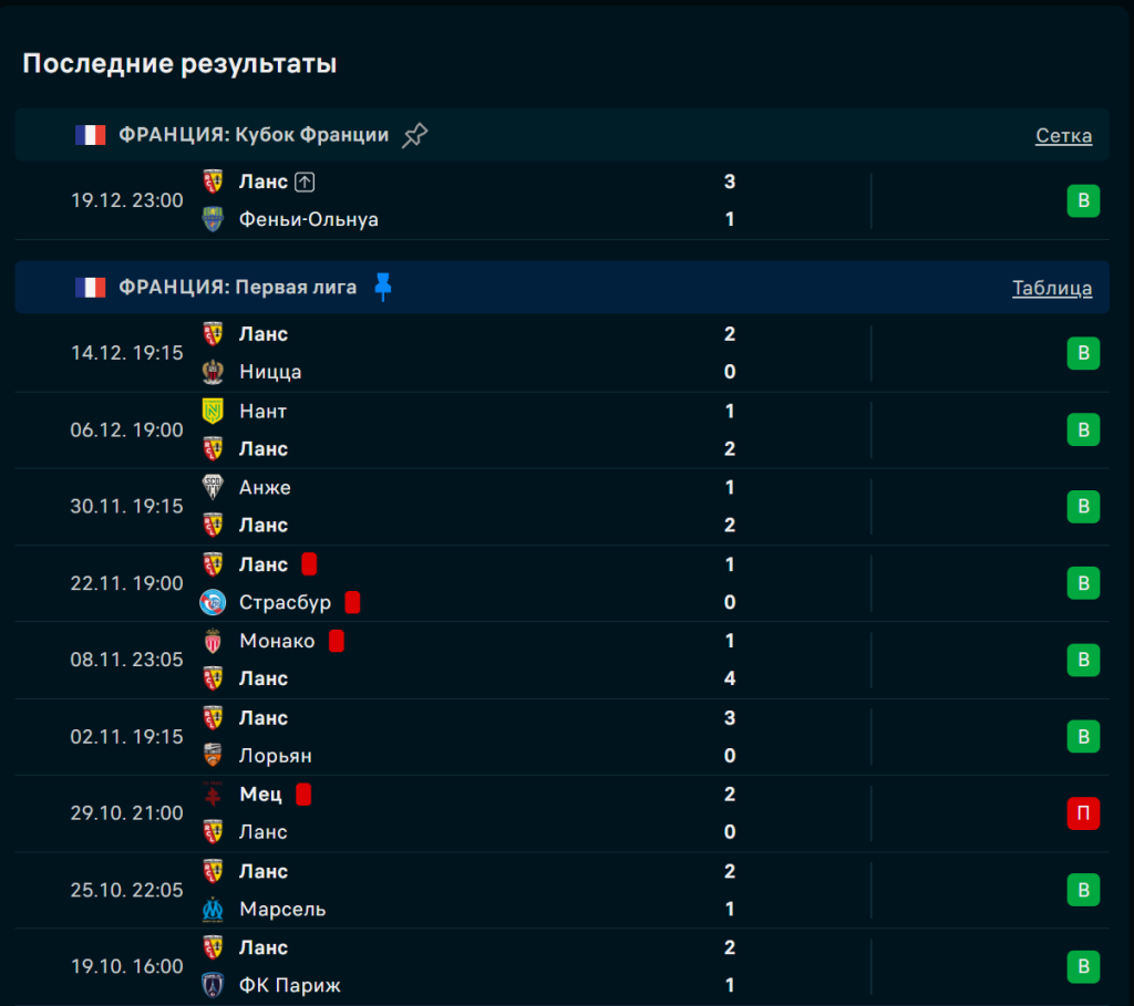 «Ланс» уверенно обыграл «Фейн-Ольнё» (3:1), «Ниццу» (2:0), «Нант» (2:1), «Анже» (2:1) и «Страсбур» (1:0). В четырёх из пяти матчей проходил ТБ(2,5), в трёх — «обе забьют». Команда стабильно набирает очки даже в сложных выездных матчах.