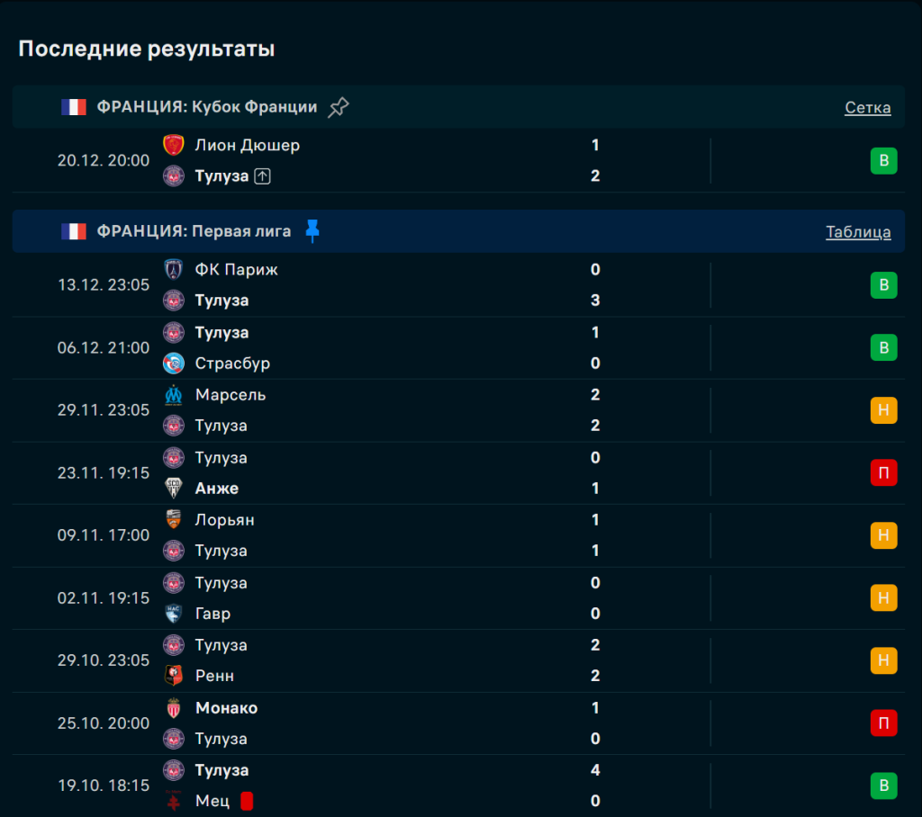«Тулуза» победила «Лион-Дюшер» (2:1), «Париж» (3:0) и «Страсбур» (1:0), сыграла вничью с «Марселем» (2:2) и проиграла «Анже» (0:1). В трёх из пяти матчей проходил ТБ(2,5), но в двух — «обе забьют» не прошло. Команда способна закрыться, но против лидеров теряет контроль в центре.