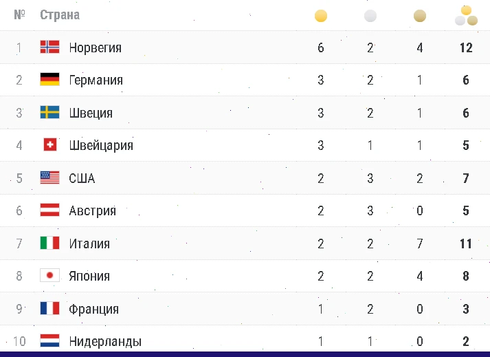 Вторую и третью строчки медального зачета Олимпиады-2026 делят сборные Швеции и Германии — у обеих команд по 3 золота, 2 серебра и 1 бронзовой награде. Борьба за лидерство в общем зачете обещает быть напряженной до самого завершения Игр в Италии.
