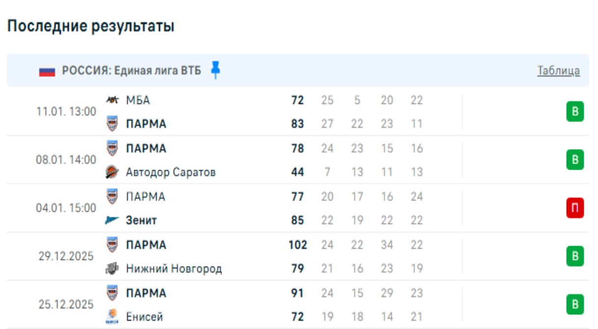 После поражения от питерского клуба Парма дважды победила в Единой лиге ВТБ. Дома пермяки разгромили саратовский Автодор 78:44. В минувшее воскресенье обыграли на выезде середняка МБА. Первая четверть прошла в равной борьбе, решающий рывок пермяки совершили во второй 10-минутке, которую выиграли со счетом 22:5. Окончательный результат 83:72 в пользу Пармы.