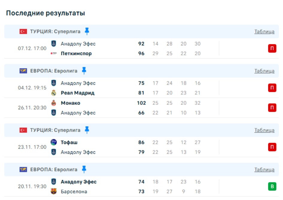 В Евролиге Анадолу Эфес проиграл в 2 предыдущих встречах. Команда Трифуновича была разгромлена во Франции Монако 66:102. В прошлом туре турки дома уступили мадридскому Реалу 75:81.