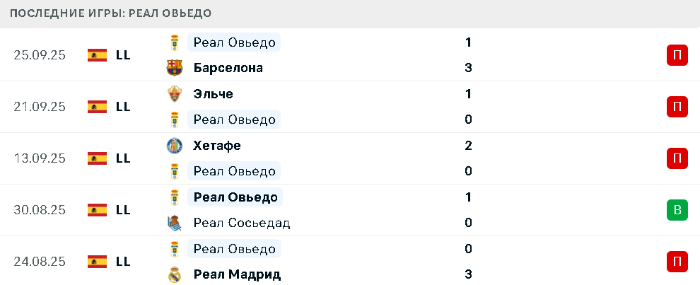В пяти предыдущих матчах Ла Лиги Овьедо одержал лишь одну победу над Реал Сосьедадом. В остальных случаях были поражения от Реала, Хетафе, Эльче и Барселоны.