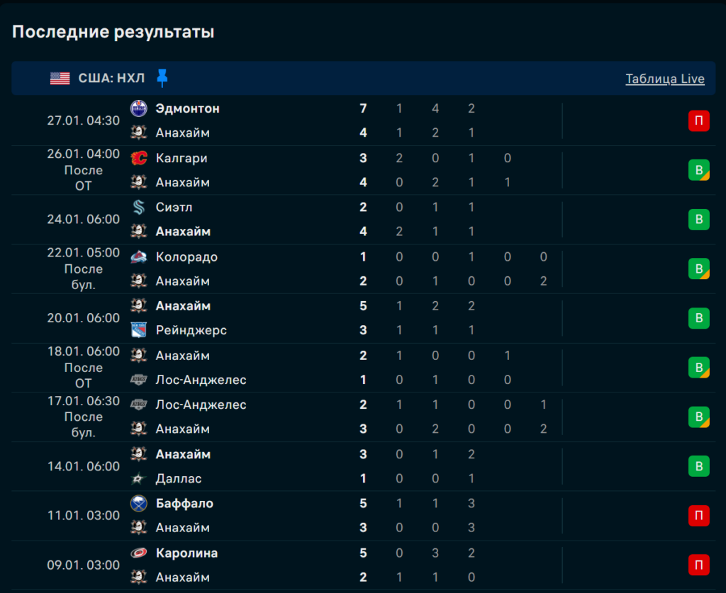 Букмекеры предлагают тотал больше 6,5 за 2,01. Это отражает не только форму, но и историю: в 75% очных матчей за последние два года было забито минимум семь шайб. Победа «Анахайма» — 2.10, но основной акцент — на результативности.