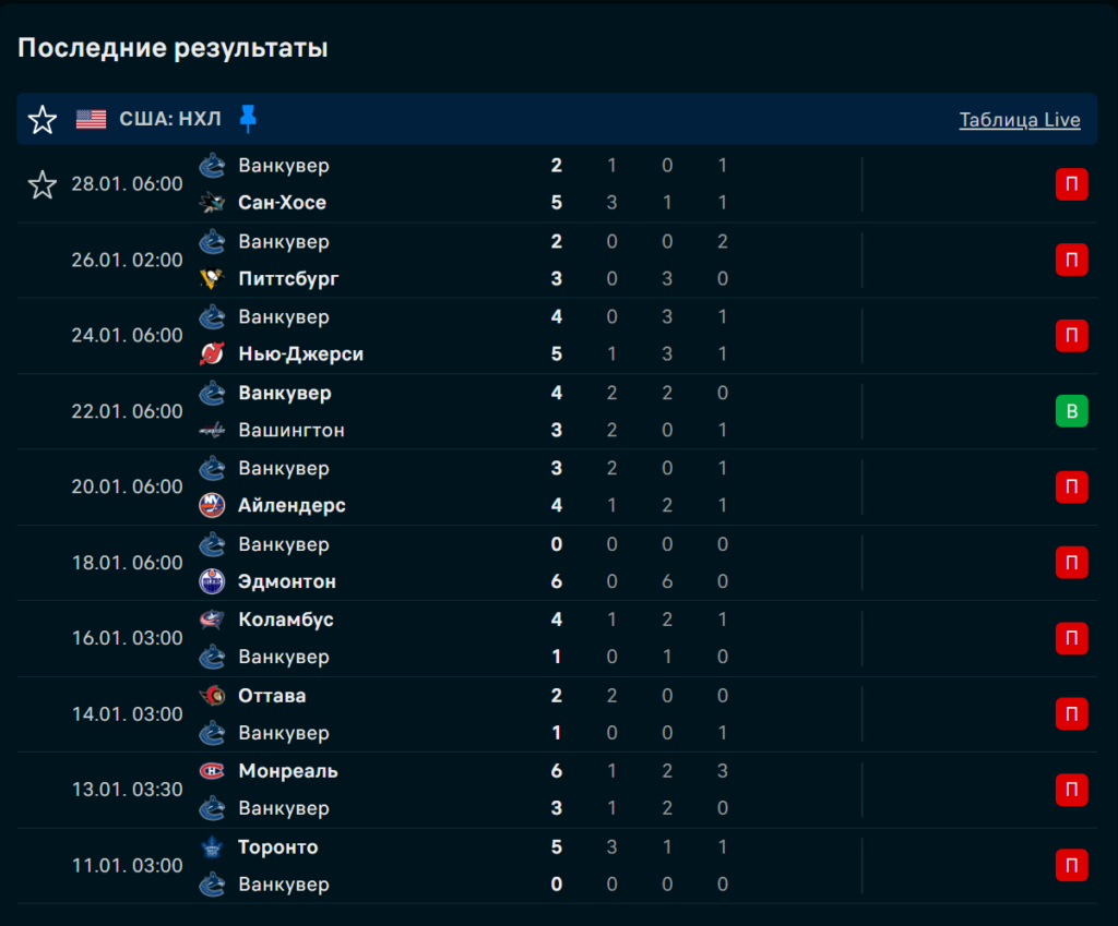 Домашний 2 : 5 с «Сан‑Хосе» — два гола в меньшинстве у своих ворот, проседание по подбору и вторым шансам. До этого 4 : 5 с «Нью‑Джерси», где «Ванкувер» создавал, но не закрыл матч по темпу и дисциплине. Тренд один: при любом давлении оборона трескается.