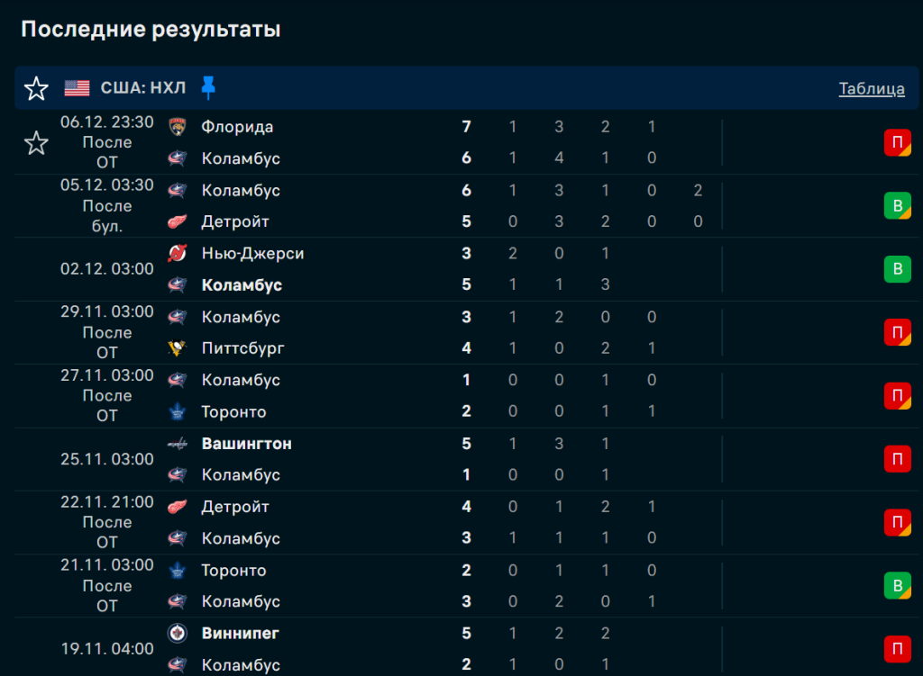 Последние игры Коламбус