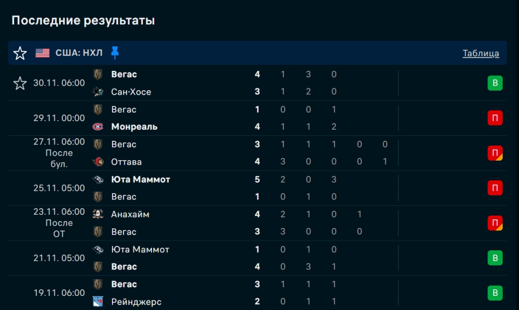 В последних пяти матчах «Вегас» показал нестабильную, но характерную игру. Среди результатов — победа над «Сан-Хосе» (4:3) и поражение от «Монреаля» (1:4). Дома команда играет собранно и использует высокий прессинг для создания давления в зоне соперника.