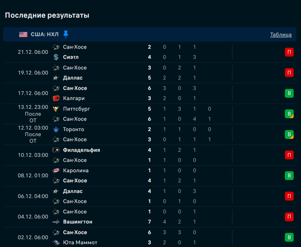 24 декабря, 06:00 МСК, T-Mobile Arena, Парадайс. Регулярный чемпионат НХЛ, Тихоокеанский дивизион. «Вегас» занимает 5-е место на Западе с 42 очками в 34 матчах, но переживает спад: три поражения подряд, включая 3:6 от «Калгари» и 3:4 от «Эдмонтона». Главный бомбардир Джек Айкел (41 очко) отсутствует. «Сан-Хосе» — 9-е место с 37 очками в 36 играх. Хозяева ослаблены травмами ключевых игроков, гости мотивированы сократить отставание от зоны плей-офф.