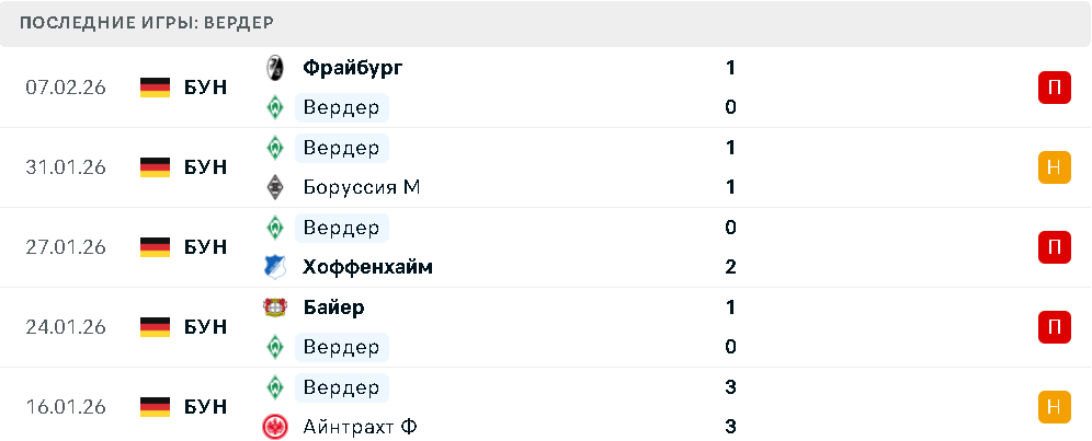 Предыдущий матч Вердер провел в гостях против Фрайбурга и уступил 0:1, пропустив на 13-й минуте. Даже получив численное преимущество на 52-й минуте, бременцы не сумели воспользоваться шансом и избежать поражения.