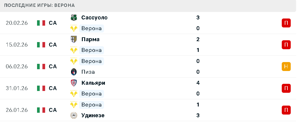 В пяти предыдущих турах «мастиффы» смогли избежать поражения лишь однажды — в домашнем матче против «Пизы». В остальных встречах команда уступила «Удинезе», «Кальяри», «Парме» и «Сассуоло», что лишь усугубило турнирное положение.