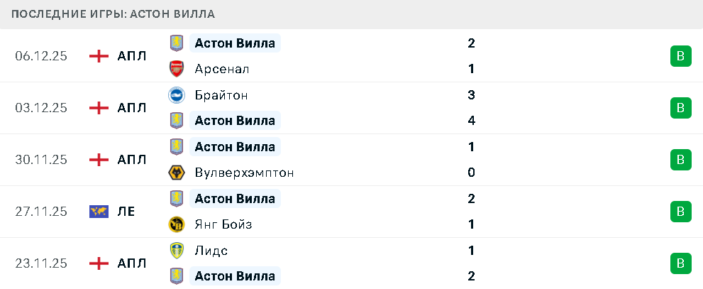 Последние игры Астон Виллы