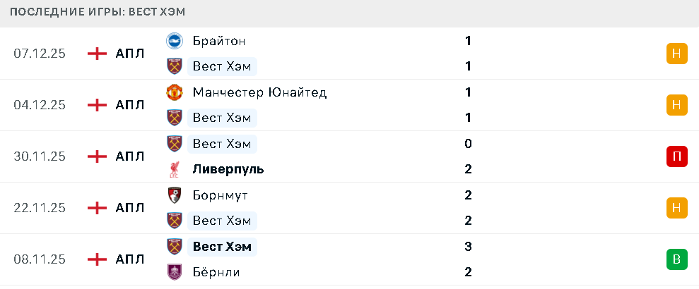Последние игры Вест Хэма