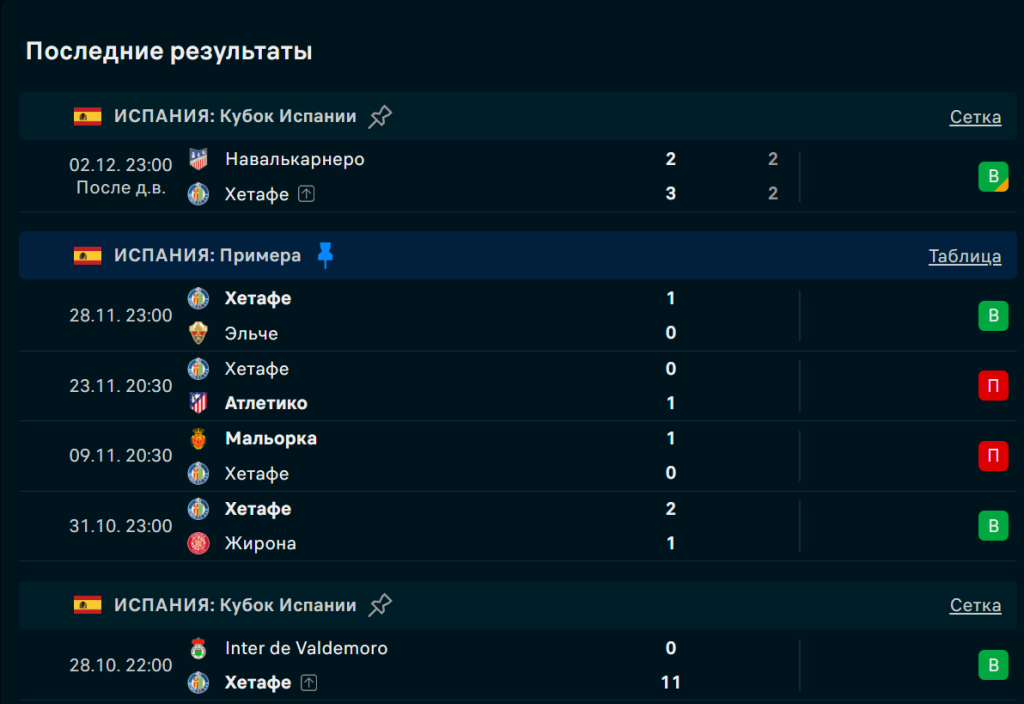 «Хетафе» занимает 7-е место с 20 очками. Команда забила 13 голов и пропустила 15. Под руководством Бордаласа «синие» сохраняют классический прагматичный стиль: компактная оборона, минимизация рисков, упор на контратаки и стандарты. В последних шести матчах «Хетафе» пять раз не пропускал более одного гола, а в четырёх играх соперники забили либо один, либо ноль голов.