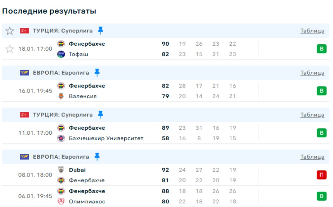 Последние игры Фенербахче
