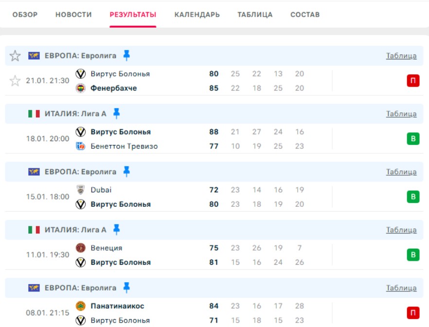 Последние игры Виртус Болоньи