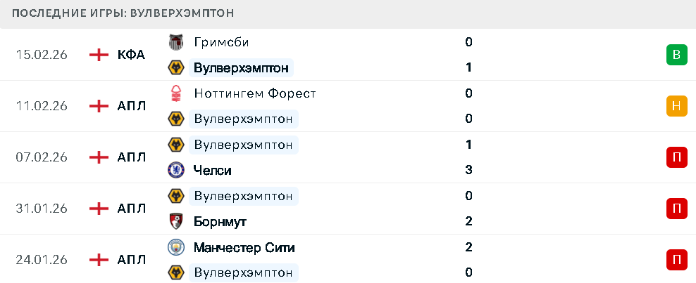 Последние игры Вулверхэмптона