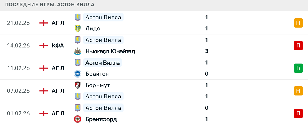 Последние игры Астон Виллы